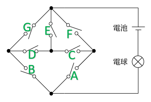 図のような、電池1個、電球1個、スイッチ7個を含む電気回路があります。